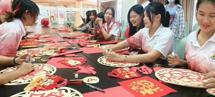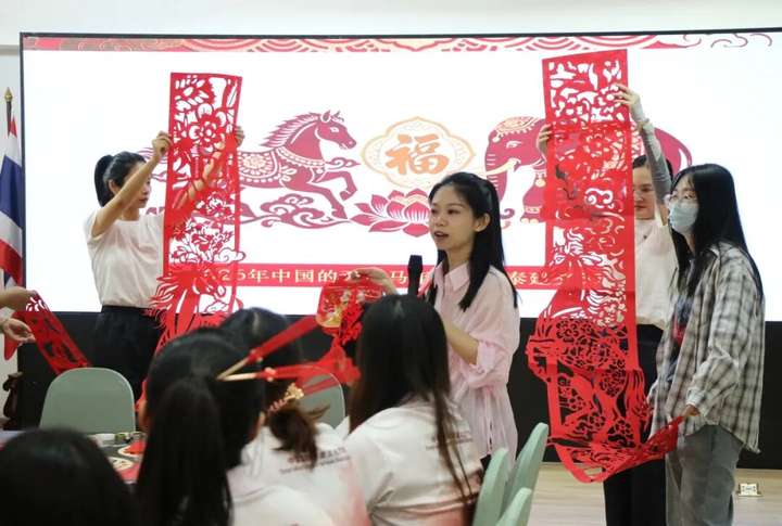 时值中泰建交51周年,一场温暖而别致的文化交流活动在泰国格乐大学展开。2月10日,农历腊月二十三小年,湖南民族职业学院赴我校交流学习团队走进尼山会议室,为泰国国际班学生带来一堂生动的中国剪纸文化课。青年教师唐潇以象征繁荣的马年生肖纹样为主题,带领泰国学子亲手剪出团花图案,并以此为载体,延伸展示传统拓印、服饰装饰等多元文化形态。红纸在指尖流转,中国红在异国绽放,中华文化的细腻与温度悄然传递。
