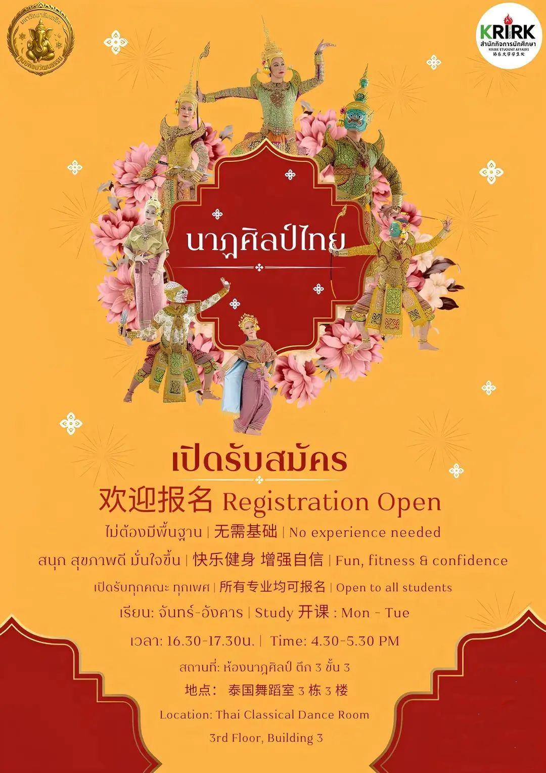为丰富校园文化生活,提升学生身心健康,泰国格乐大学学生处特别推出免费泰国舞蹈课程,面向全校学生开放,无需舞蹈基础,欢迎所有专业同学报名参与!