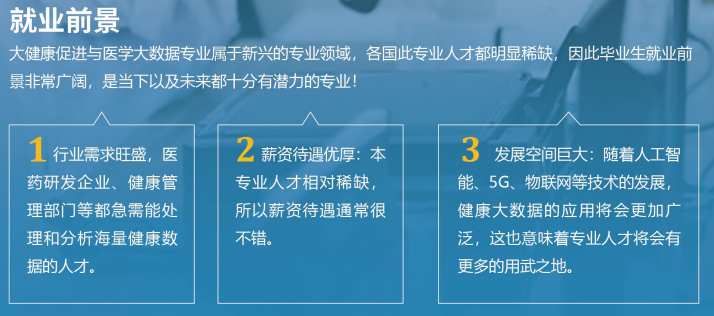大医疗大健康领域的发展,离不开大数据支撑。本专业包括了统计学、生物信息学、计算机科学等学科的知识。学生将通过专业的学习,掌握如何从海量健康数据中提取信息,为疾病预防、治疗提供科学依据。