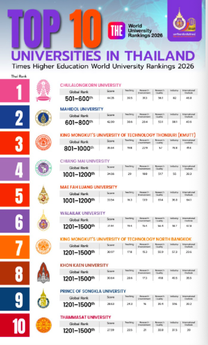 日前,全球知名大学排名机构泰晤士高等教育(THE)公布了2026年世界大学排名(THE World University Rankings 2026)结果。数据显示,全球上榜大学数量从去年的2092所增至2191所,泰国共有21所大学上榜。